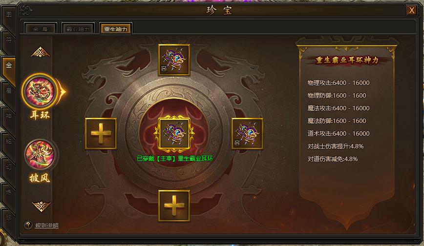 重生霸业神力拓展4个重生霸业内饰孔位,可前往【珍宝-金身-重生神力】查看