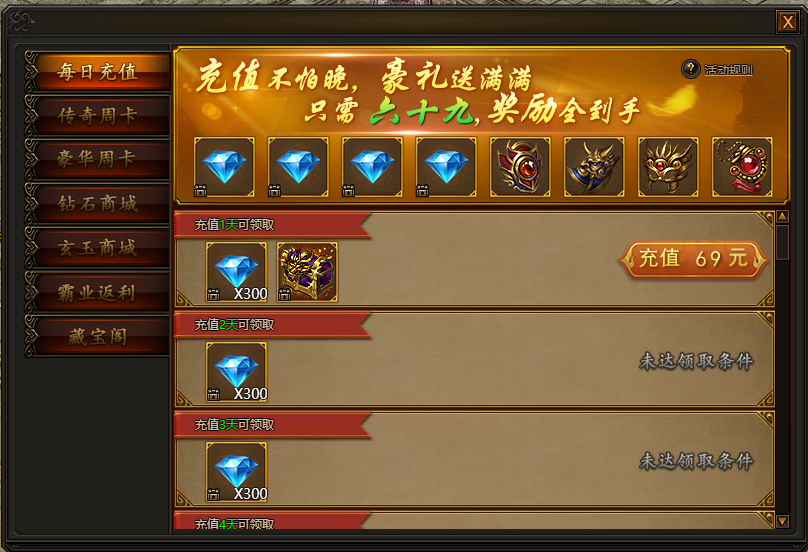 单日累计充值6900元宝达到指定天数,可以领取对应档位奖励