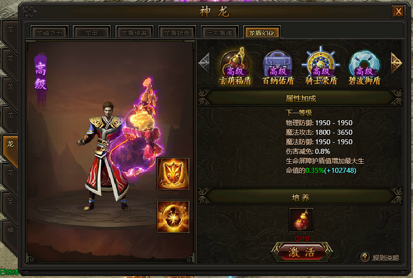 激活高级龙盾幻化可以激活以下生命屏障高级效果:
