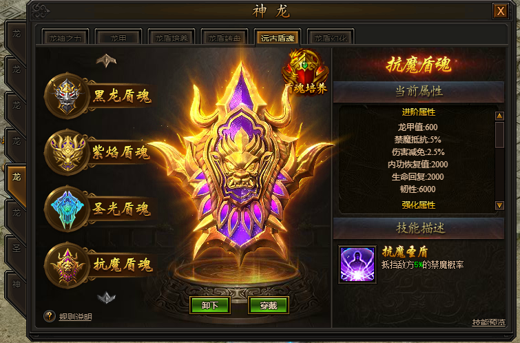 新增【抗禁魔盾魂】,激活后可永久增加1%~5%的禁魔抵抗,可前往【神龙-龙甲-远古盾魂】查看