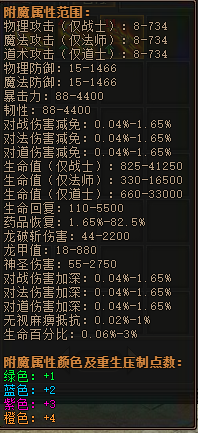 由于不同等级的重生装备附魔属性的最高数值不同(等级越高,数值上限越高),所以低等级装备附魔转高等级时,附魔颜色有可能会改变(颜色等级从高到低:橙、紫、蓝、绿),进而额外压制点数会下降