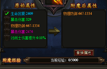 附魔经验:引入新机制,每次附魔会根据使用材料的不同,获得不同的经验数,当经验条满后下次附魔必出橙色,橙色就是当前重数神装的此条附魔属性的最高数值。