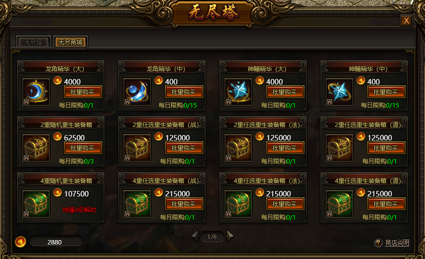 可前往【荒漠-无尽塔-无尽商城】消耗无尽币获得重生装备等强力道具